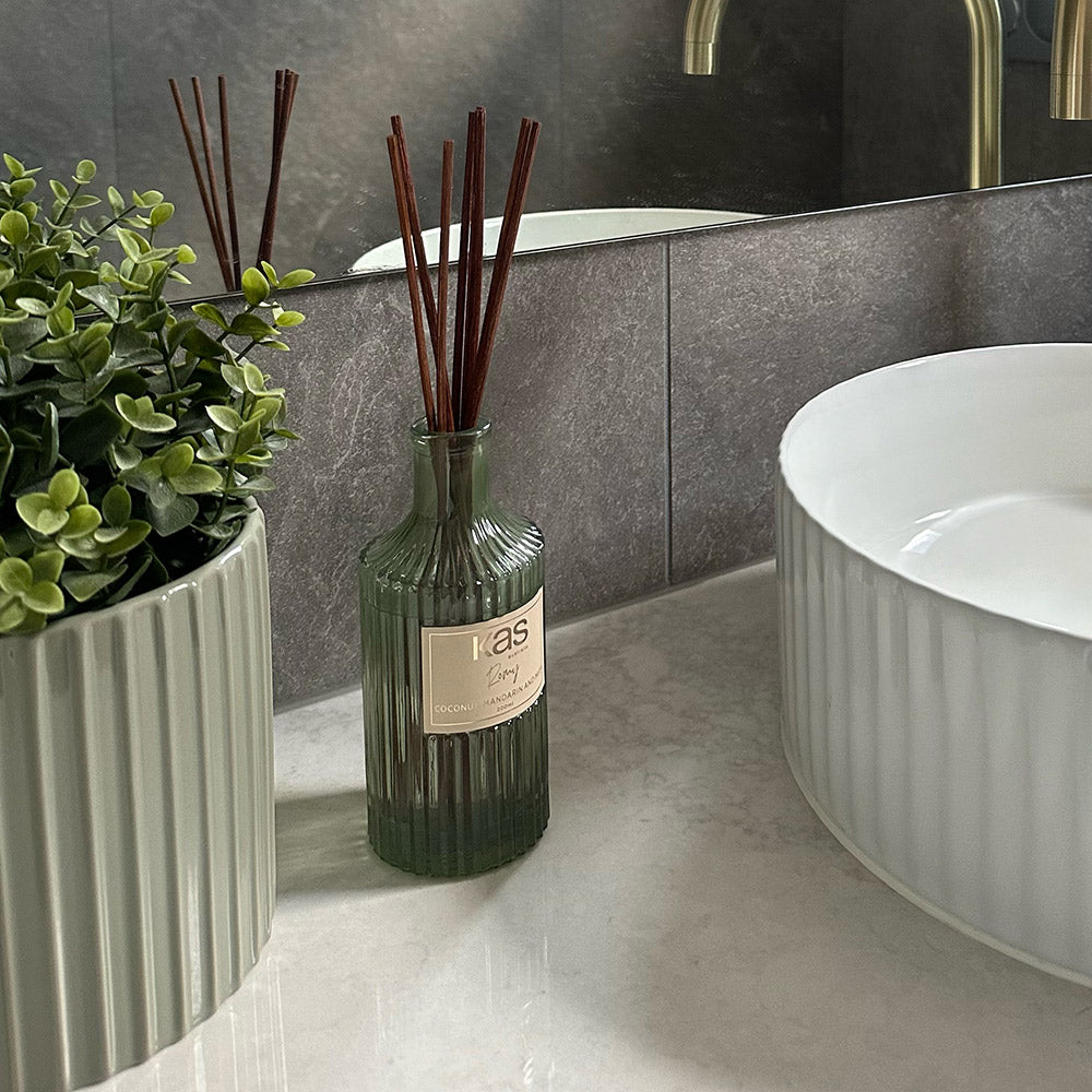 Immerse yourself in the tropical allure of KAS ROMY's Coconut, Mandarin & Musk Ribbed Glass Diffuser. This 200ml oil diffuser harmoniously blends the creamy richness of coconut with the juicy zest of mandarin and the subtle sensuality of musk to create an ambience that's both refreshing and deeply comforting. The diffusers unique ribbed glass design not only adds an element of visual texture to your decor but also enhances the diffusion of this heavenly scent throughout your space. Packaged in a box adorned with contemporary abstract art, the aesthetics of this product make it a perfect gift or a stylish addition to your own home. 200ml oil diffuser, 10% fragrance with 6 wooden reeds. Made in China.