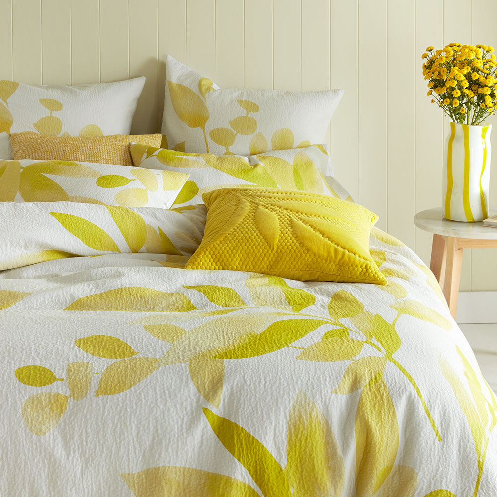 Look to the bright side of life with the Ghost quilt cover set. Reminiscent of a visit to Capri, it is printed on a luxurious cotton jacquard and features a watercolour print of leaf silhouettes in a citrus shade that will remind you to live the very best dolce vita when you wake every morning.