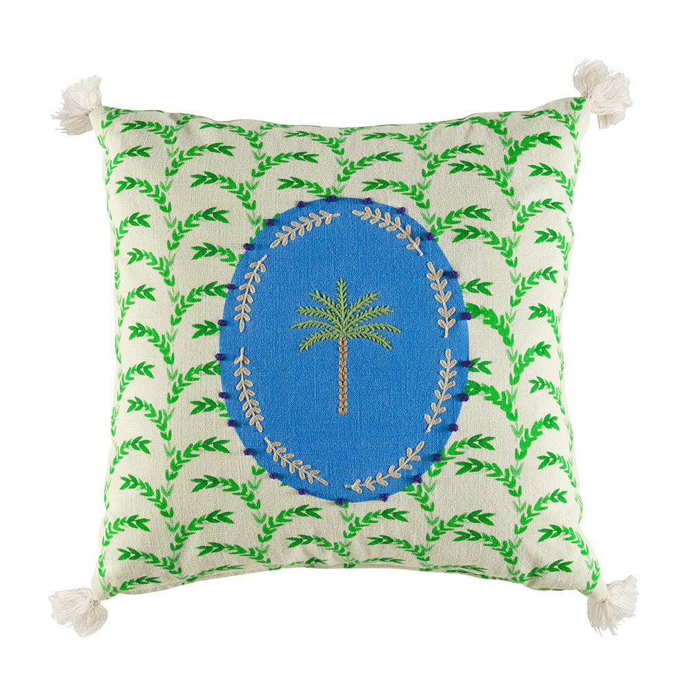 Bring a touch of paradise into your home with the Magic Cushion. This cushion blends intricate embroidery with a printed texture on soft cotton slub, finished with playful tassels.