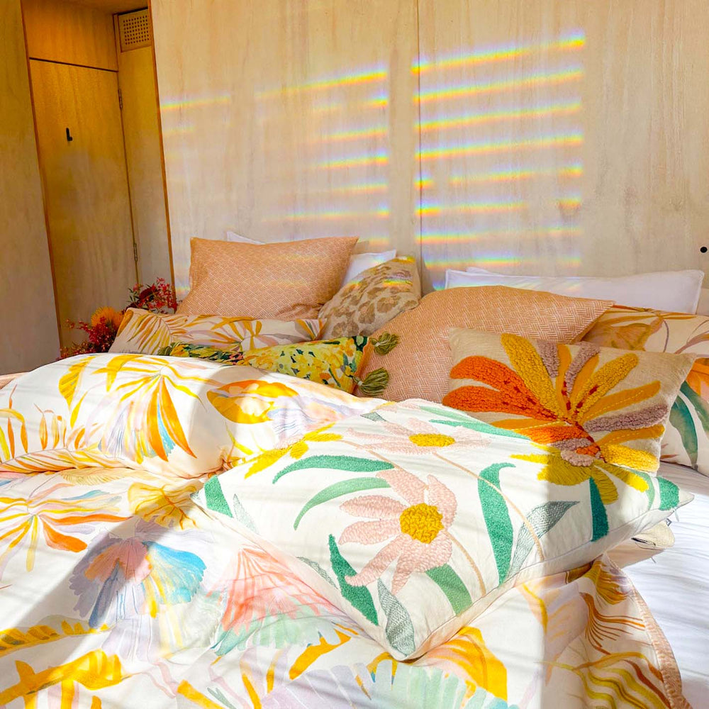 Indulge in natures embrace with Ohana bed linen. The beautiful hand painted leaf design in pastel shades on soft cotton will breathe life into your sanctuary. The look is refined with a weave print reverse.