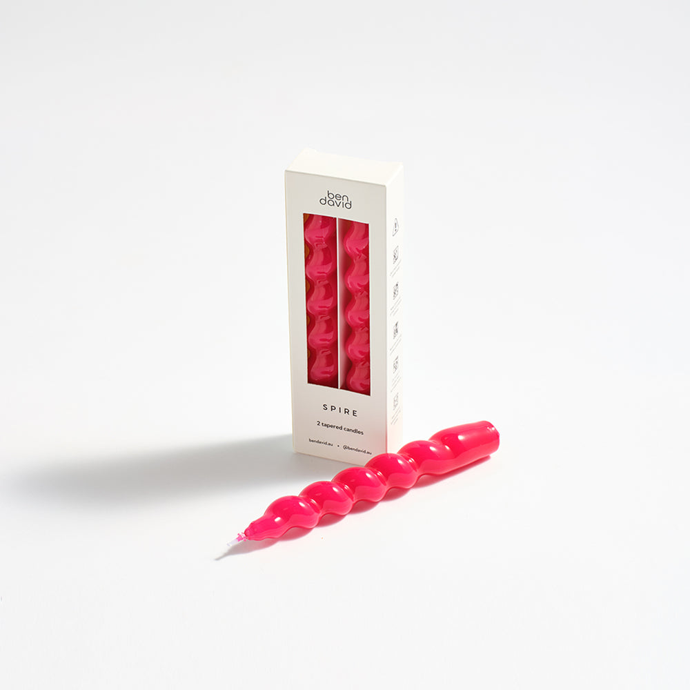 Includes 2 x Spire Tapered Candles. Handmade. Burning time of individual candle is about 5 hours. Pair weigh 120 grams.